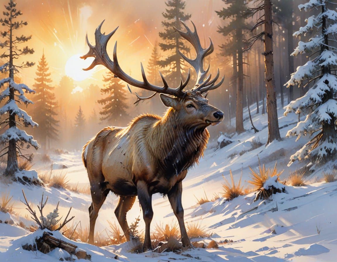 This image shows an elk silhouetted against a snowy ridge with pine trees. The artwork evokes watercolor techniques, featuring soft brushstrokes and warm lighting, in a dreamy, ethereal style.