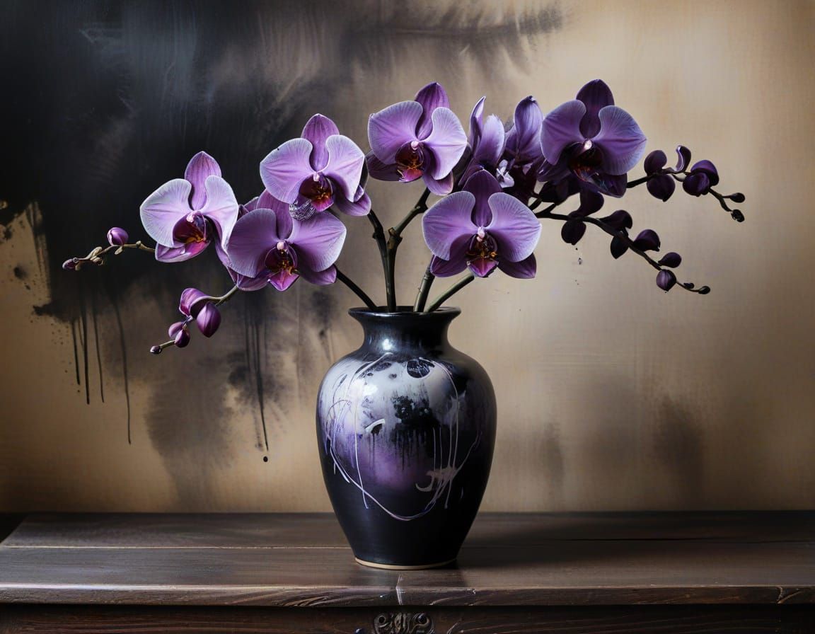 A traditional ink wash painting of a purple and black orchid in a vase. The artwork displays delicate brushstrokes and subtle tonal gradations on a dark wooden desk.