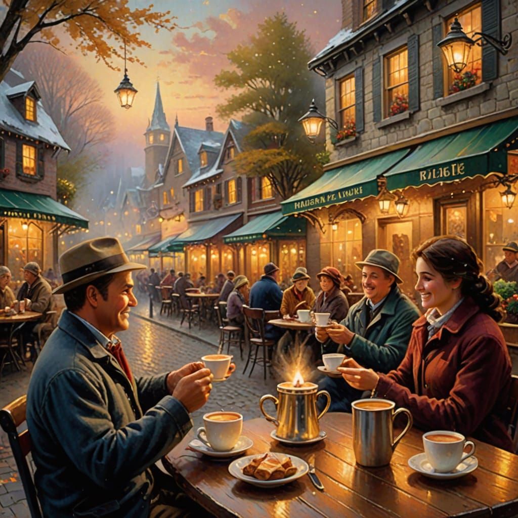 This image shows people sharing hot drinks at an outdoor cafe, in a warm and inviting atmosphere. The oil painting style features soft brushstrokes, golden colors, and twinkling lights.
