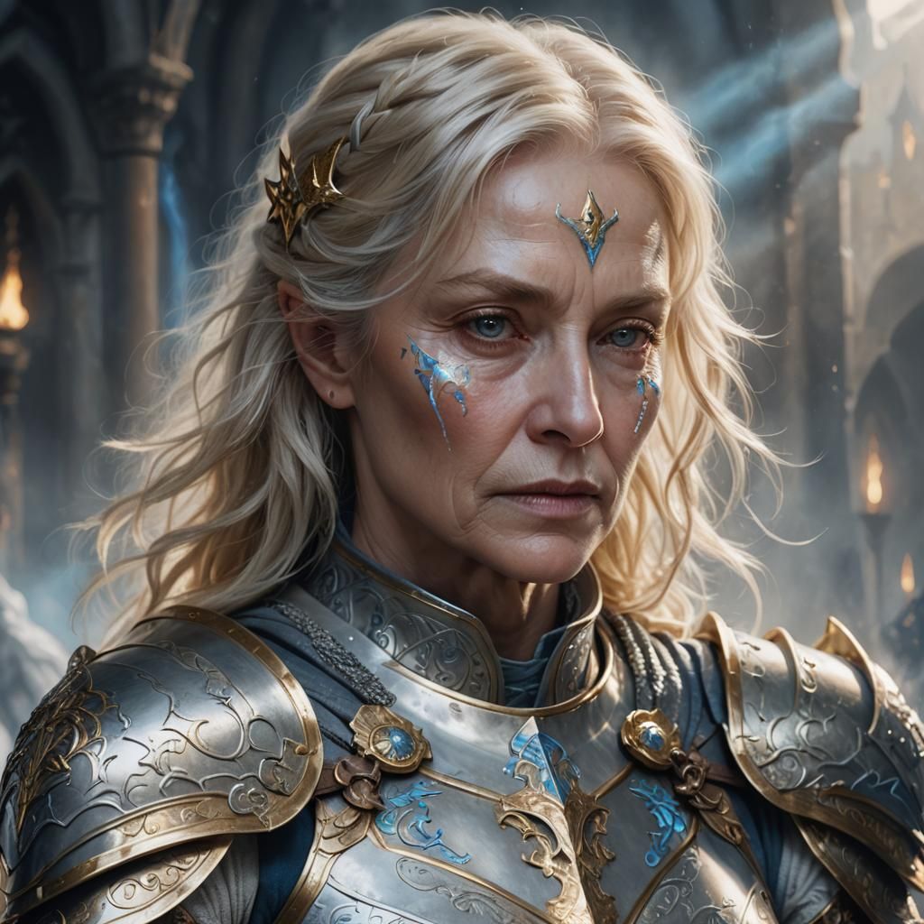 A close-up portrait of an elderly blonde female knight in shining silver armor. The fantasy art features glowing runes, soft lighting, and a misty atmosphere, rendered with incredible detail.