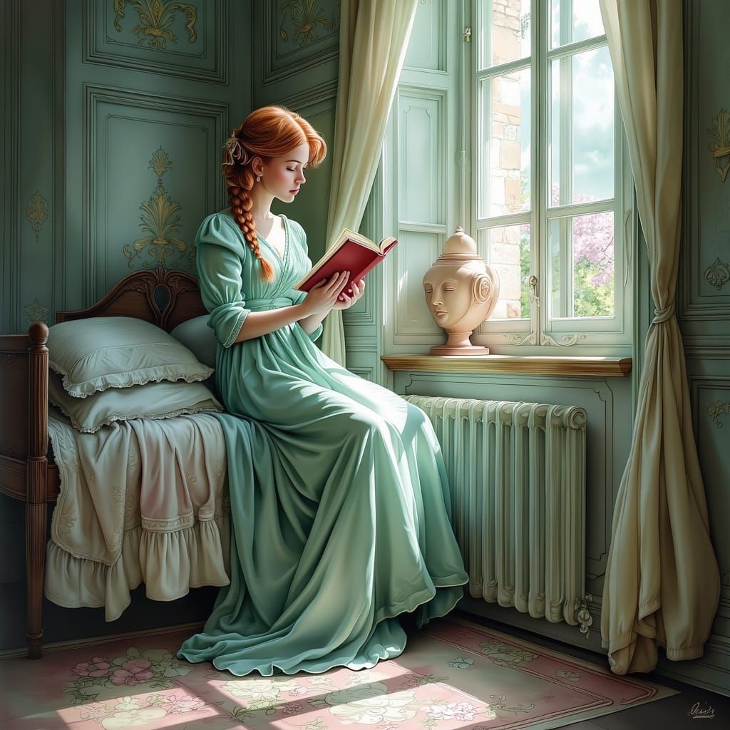 A touching scene of a young blonde girl in a gray dress, holding a prayer book, sitting beside a red-haired boy in bed, bathed in sunlight, rendered with volumetric lighting in a romantic style.