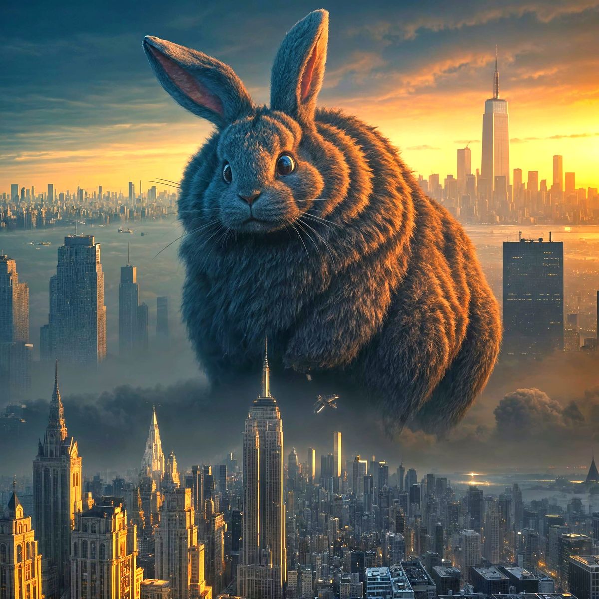 Easily generate your own giant fluffy rabbits causing chaos in cities with our free AI image generator.