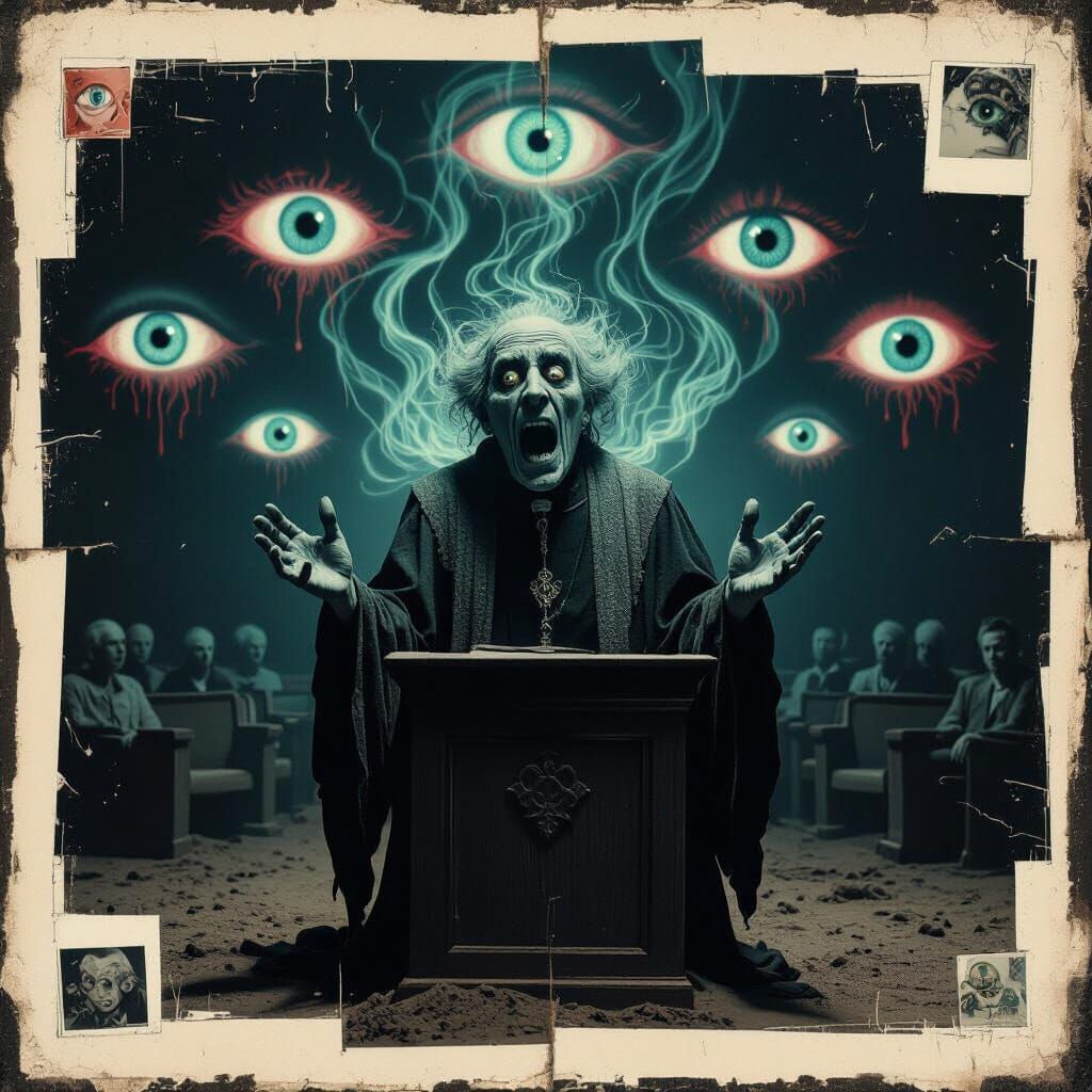 This image shows a disturbing vintage rotoscoping collage of a creepy, ancient preacher with evil energy swirling around him. Inspired by "The Ring," it features neon eyes and unsettling textures, creating a liminal atmosphere.