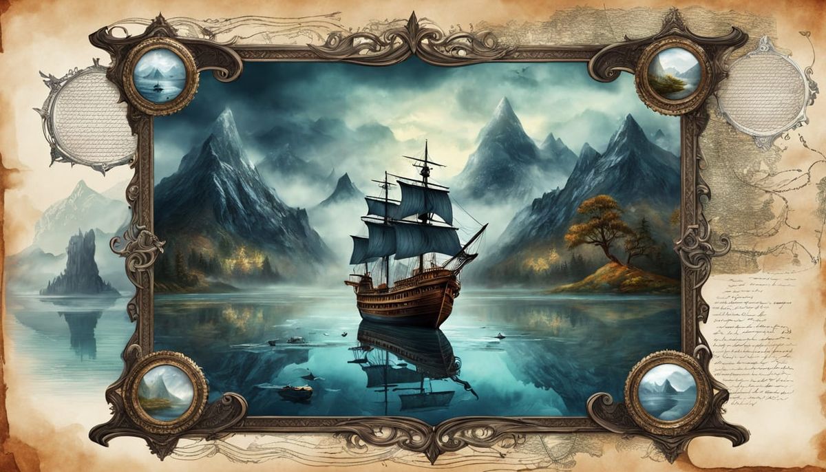 This image displays a ghostly galleon ship on a reflective lake, set against misty mountains. The background features an old-world treasure map with intricate details and illustrations, evoking a vintage, ethereal mood.