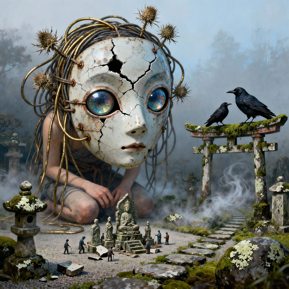 This hyperrealistic acrylic painting depicts a haunting creature with large eyes behind a cracked voodoo mask, set in a misty zen garden with tiny builders and ravens.