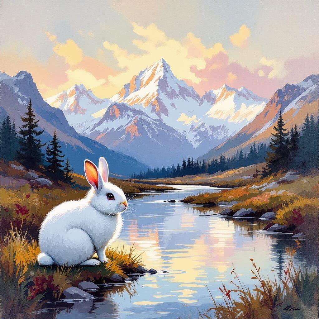This image showcases a white rabbit by a babbling brook with majestic snowy mountains behind it. Rendered in a vibrant watercolor style with visible brushstrokes and blended colors.