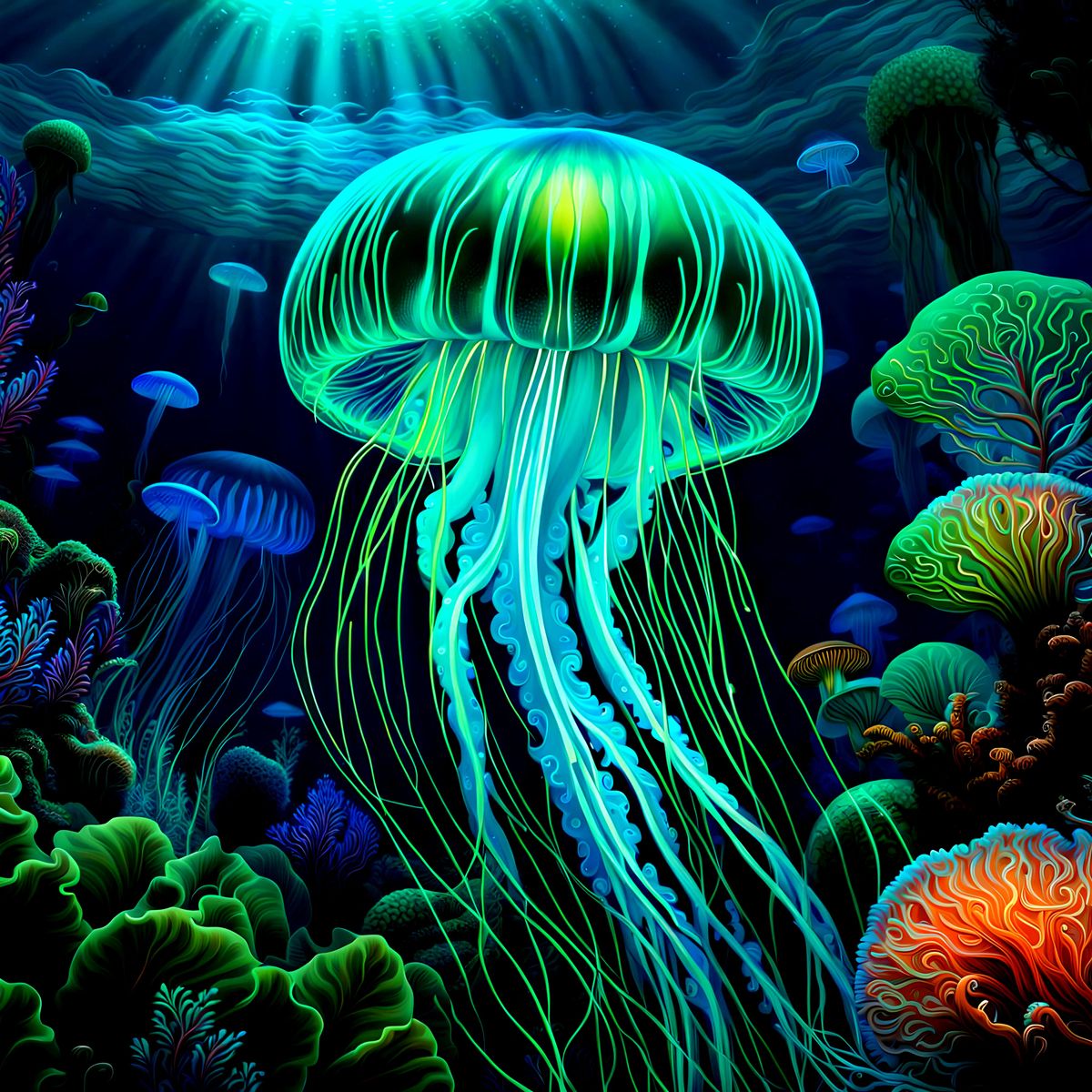 This image shows a large, turquoise jellyfish in a vibrant underwater scene. The bioluminescent jellyfish is surrounded by intricate blue-green sea plants, animals, and fish, rendered with hyper-realistic detail.