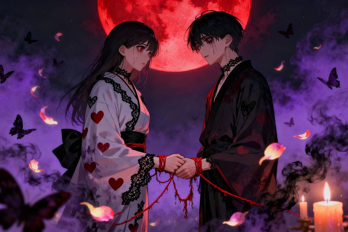 Spooky anime-style cursed couple on Valentine’s night — two lovers standing under a blood-red moon, their hands almost touching but bound by a fraying red string of fate that unravels into dark mist, glowing petals swirling around them and fading into shadow butterflies, their eyes reflecting sorrow and enchantment, detailed kimonos adorned with heart motifs and black lace, eerie candlelight flickering through violet fog, cinematic anime lighting, emotional and haunting tone, ethereal and tragic atmosphere