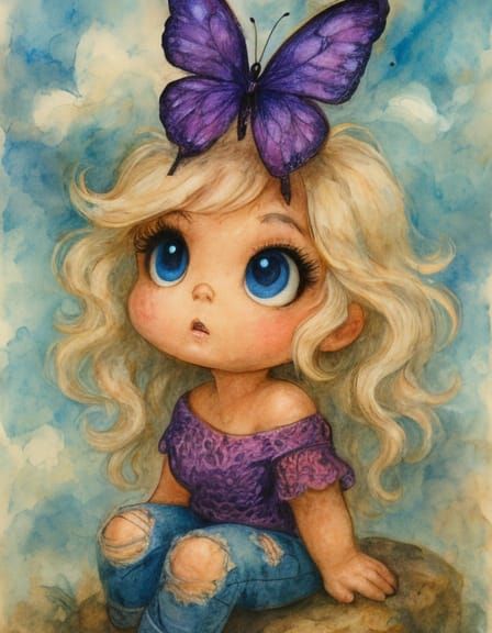 This image shows a whimsical chibi-style girl with blonde hair and big blue eyes sitting on a rock. A large purple butterfly sits atop her head, set against a cloudy sky.