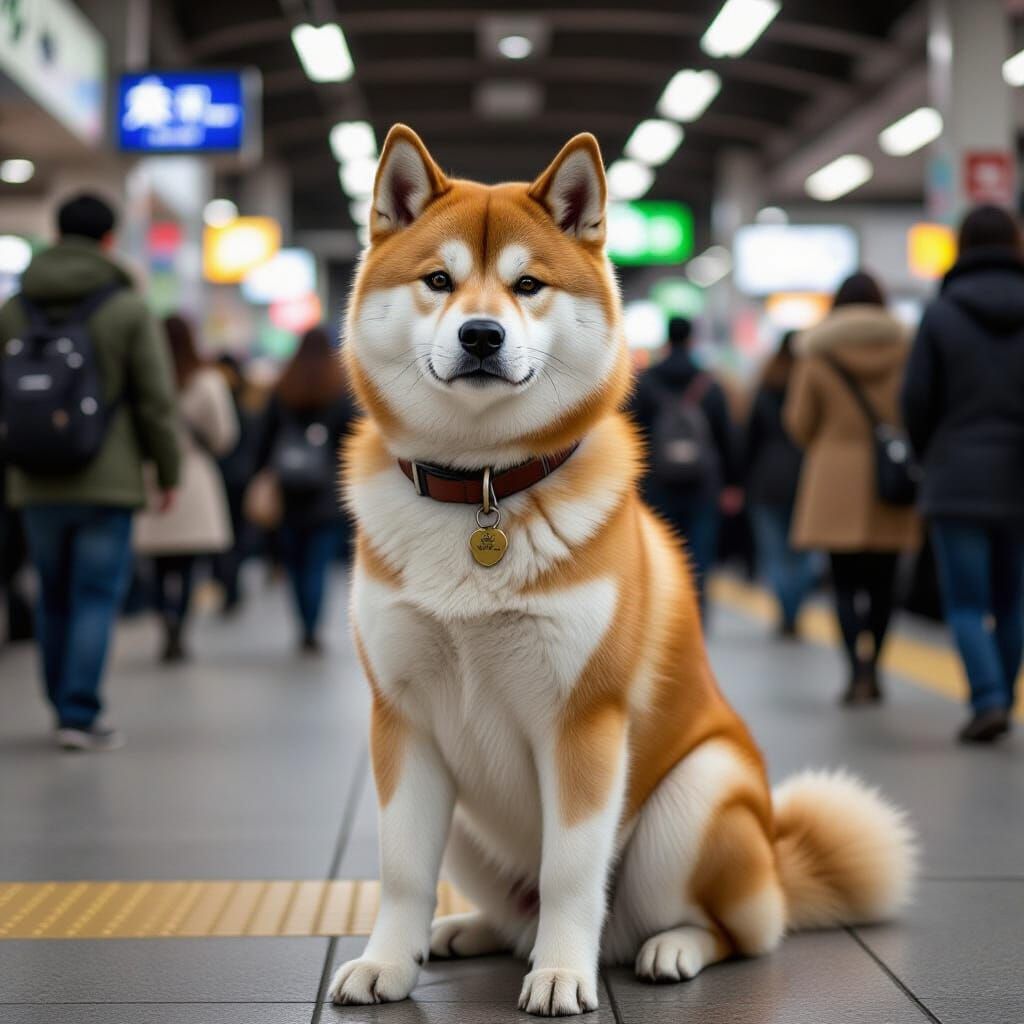 This image shows Hachikō, an Akita dog, faithfully waiting at Shibuya station. The artwork evokes realism with emotive qualities, reminiscent of classic Japanese aesthetics.
