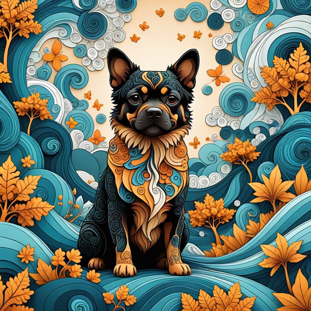This image is a mesmerizing blend of fractal patterns and 3D shading, capturing the joy of pets playing with their friends in a vibrant, abstract outdoor setting.