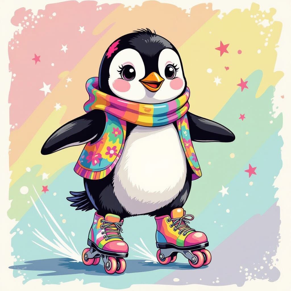 This digital illustration features an adorable penguin in a bright outfit, happily gliding on colorful roller skates. The art style uses bold lines and textured brushes with a whimsical, pastel color palette.