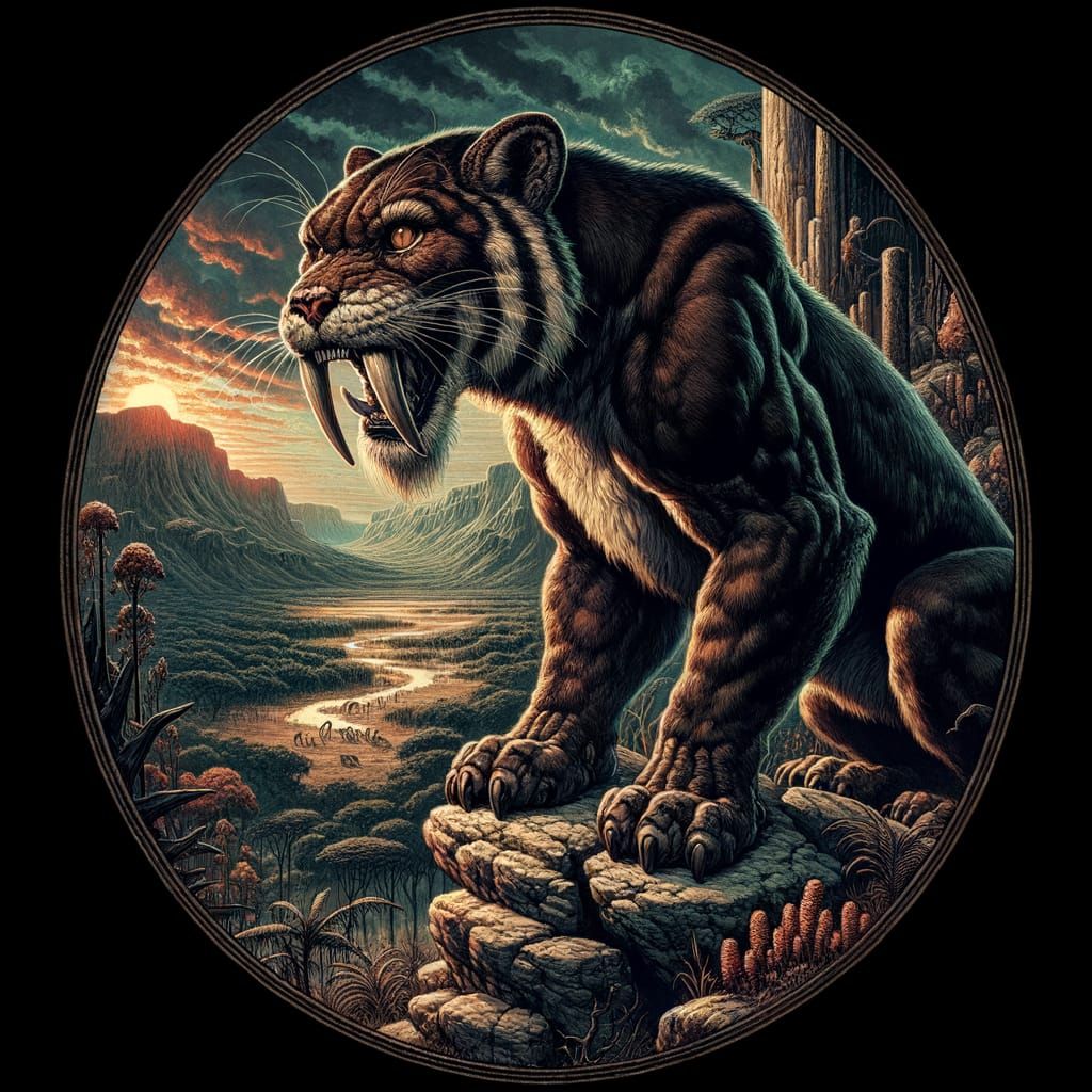 A striking picture of a muscular saber-toothed cat on a rocky crag. The feline predator surveys a vast prehistoric savanna filled with diverse plant life, captured with vibrant dark hues in a vintage aesthetic.