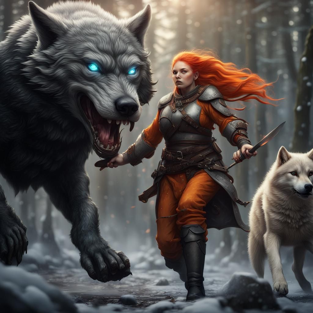 This image shows a brave young girl with orange hair and a thin, bald man fighting wolves. The artwork features intricate details, deep colors, and a fantastical concept.