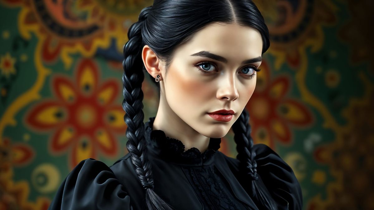 This image is a stunning representation of a pale-skinned woman with black braided pigtails, dressed in an intricately designed antique black dress, set against a colorful background, exuding a sense of drama and Gothic elegance.