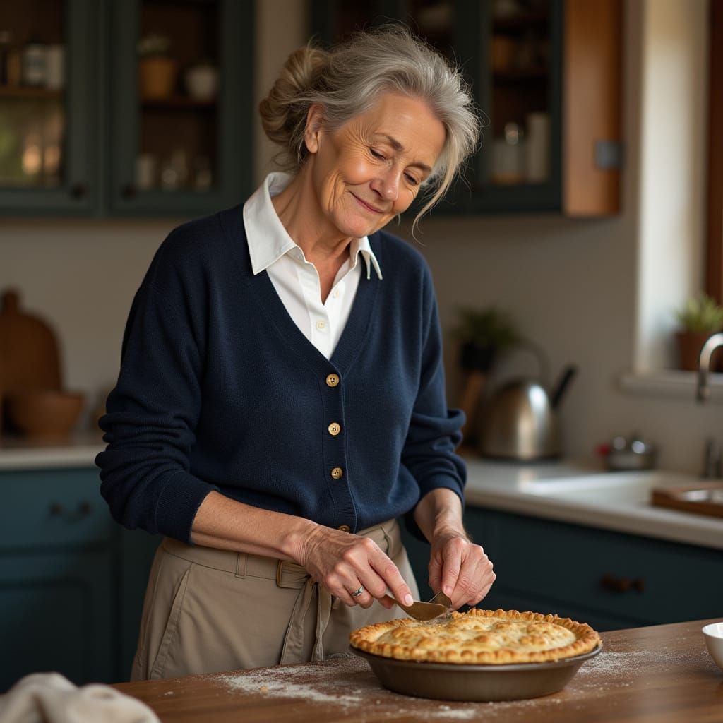 This image shows a hyper realistic depiction of a woman in her late 50's baking a pie in her kitchen, with intricate textures and soft golden lighting reminiscent of contemporary realism.