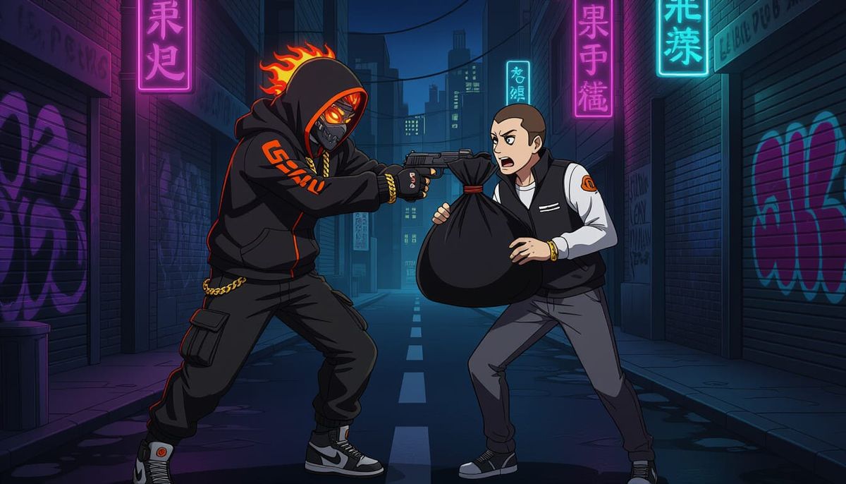 This image shows a mafia boss holding a gun to another character's head as he hands over a bag of money. The scene is set in a dark alley with graffiti and neon lights, in a cel-shaded anime aesthetic.