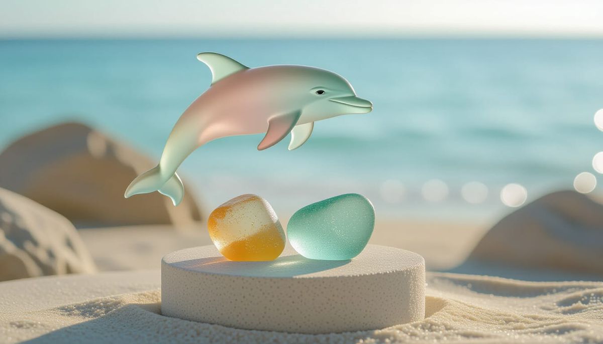 This image showcases a delicate sculpture of a leaping dolphin made from frosted sea glass in soft pastel colors, resting on a sandy pedestal against an ocean backdrop. Rendered in a minimalist style with smooth forms and gentle lighting.