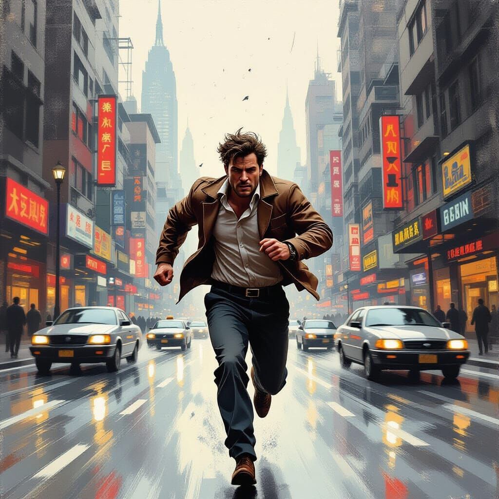 This image depicts a man rushing through a blurred cityscape, symbolizing life's fast pace. It blends futuristic design with gritty realism and whimsical elements.
