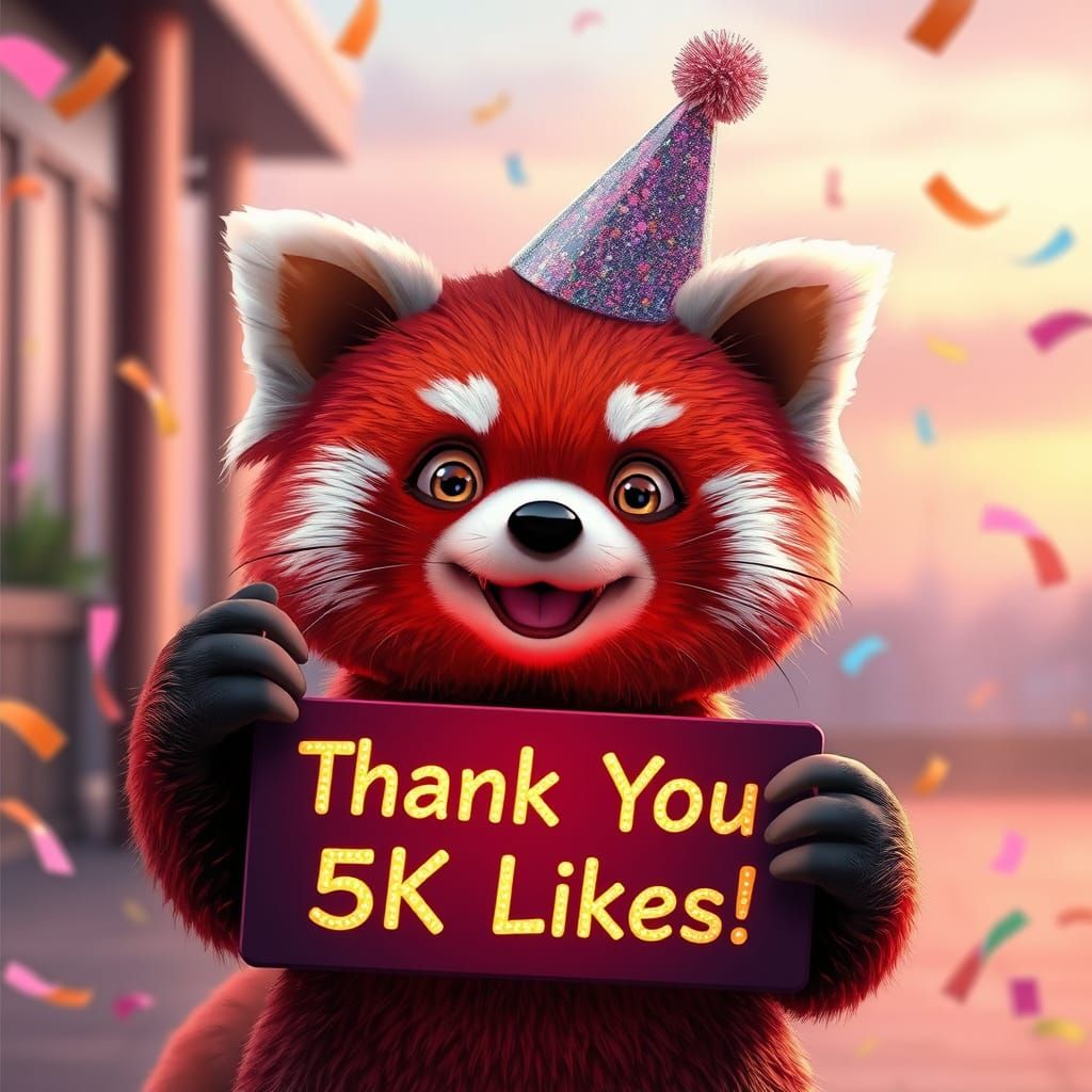 A charming image of a red panda wearing a party hat and holding a sign that reads "Thank You - 5K Likes!". The scene is rendered in a photorealistic 3D anime style, with confetti and a pastel sky.