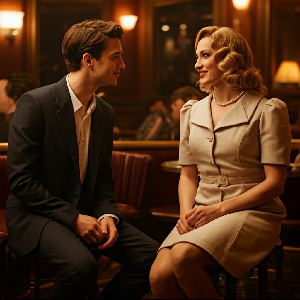 A striking image of a confident woman and a shy man in a sophisticated jazz club setting, captured with a cinematic film still aesthetic and rich color grading.