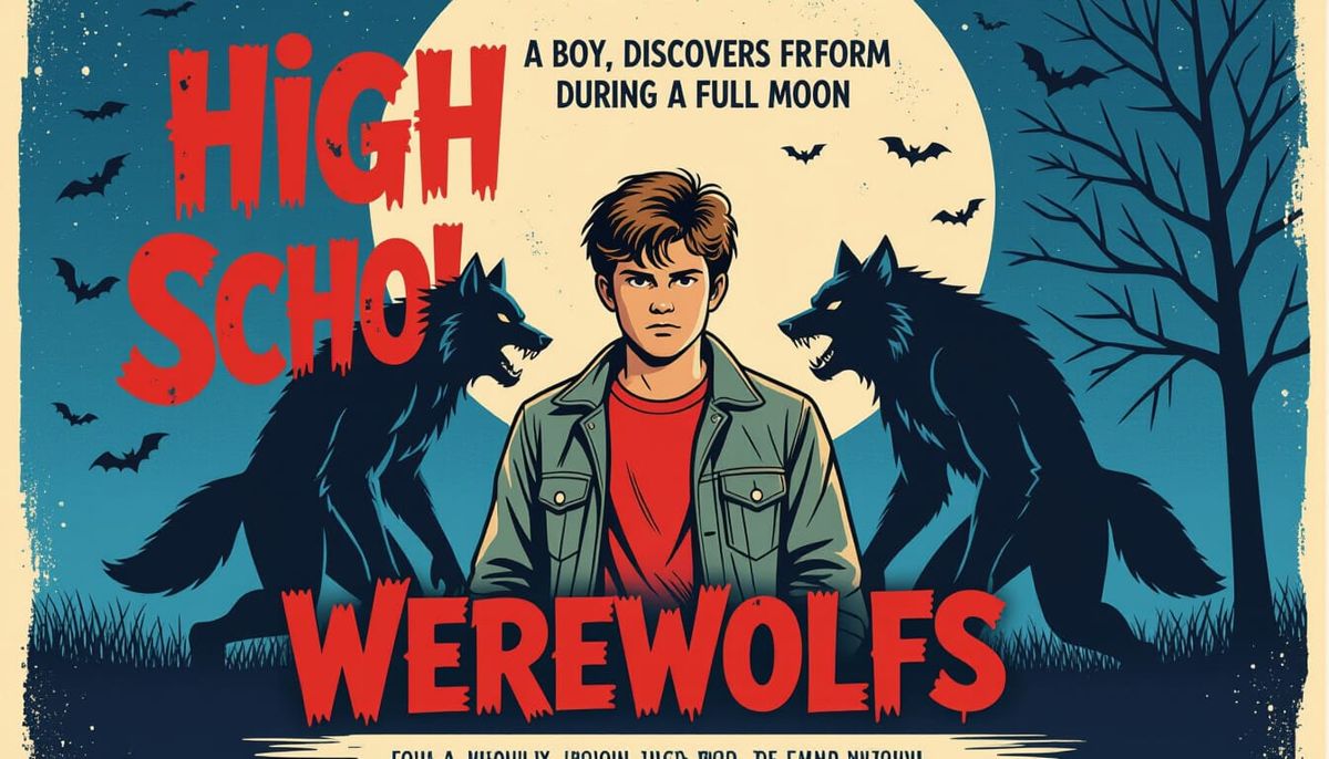 This image shows a retro 80s movie poster with werewolves. The poster depicts a high school setting and the movie title "Highschool Werewolfs" in a grunge style.