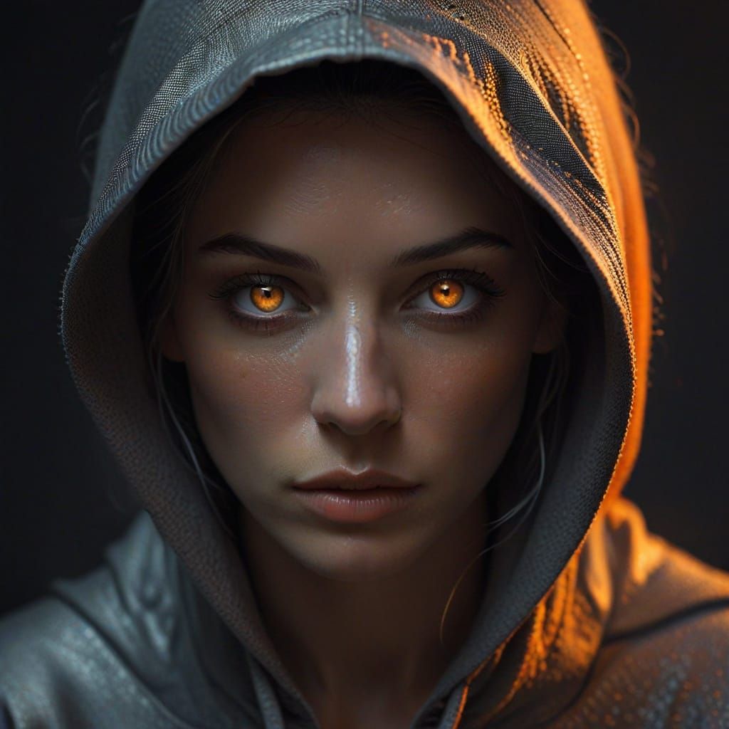 This haunting portrait captures a young woman's emotional intensity, with piercing grey eyes and a subtle, sketchy texture, set against a backdrop of dark silver and orange hues, evoking a sense of resilience and deep sadness.