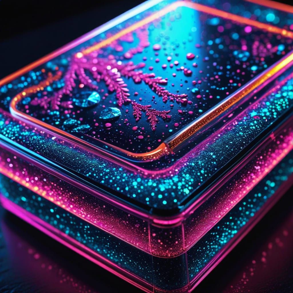 A close-up image showcases glitter jewelry in a neon case. This vibrant digital art features neon reflections, sparkling glitter details, and bright complementary colors, rendered in 4K resolution.