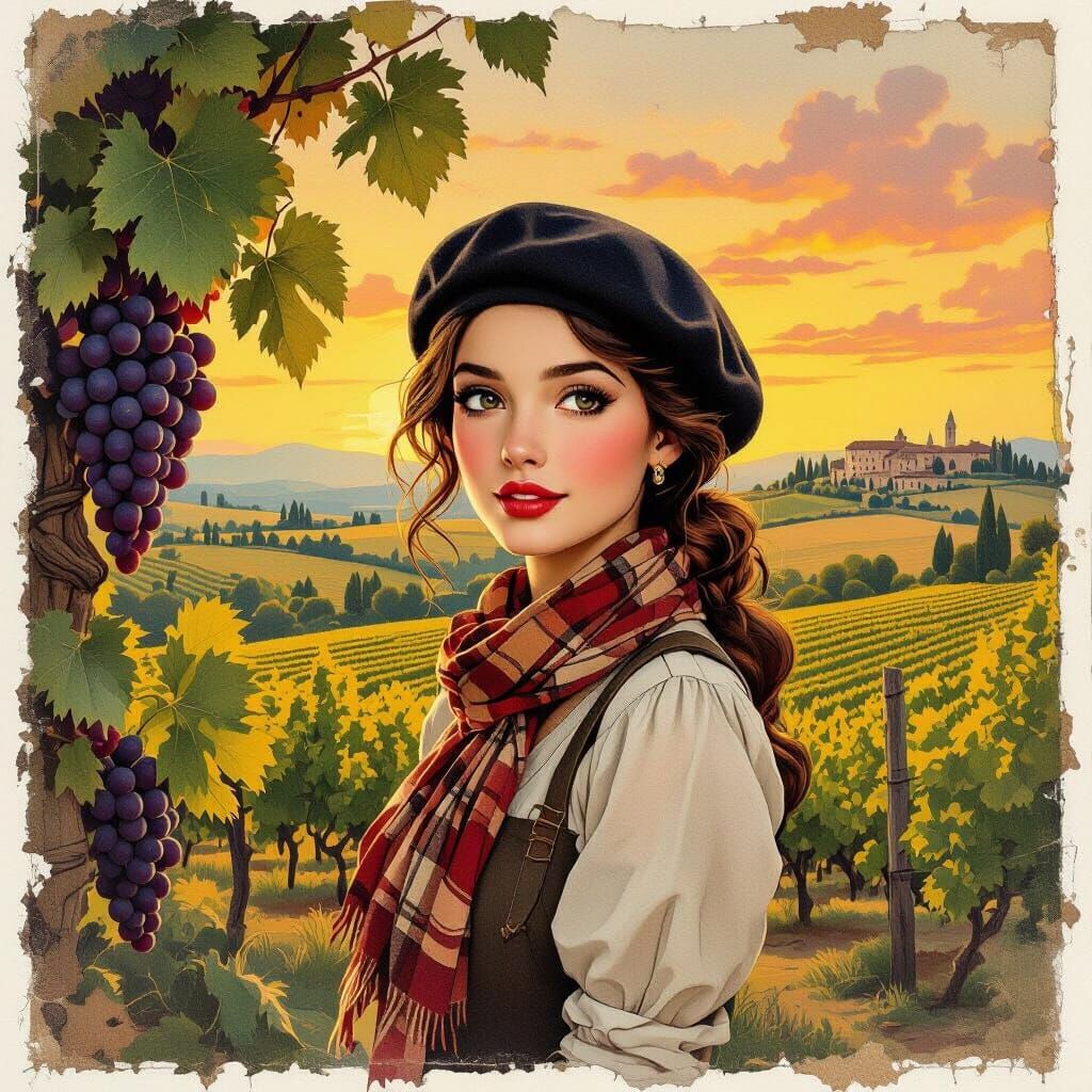 Italian colorfulness, cinematic romance, tempera, impasto, legal illustration, poster, landscape, ink-painted edges, summer close-up, airy happy gentle girl, vintage Verona, windy cinematic portrait on cracked paper, detailed textures, dynamic pose, trees and grapes, dynamic pose, rustic farmhouse, rustic ...