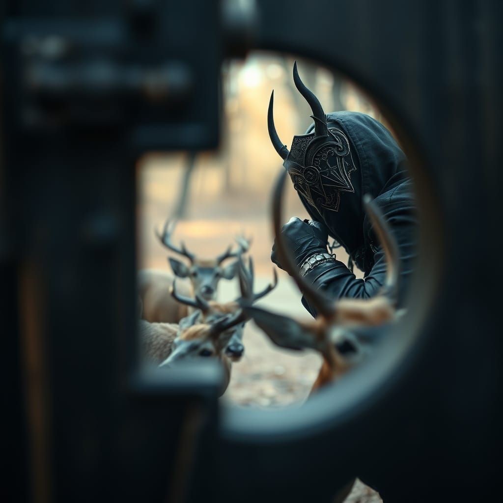 A dramatic image of a hunter in a dark costume, crouched and silent, pursuing deer. The scene is viewed through a keyhole, with a shallow depth of field and bokeh effects, reminiscent of cinematic photography.