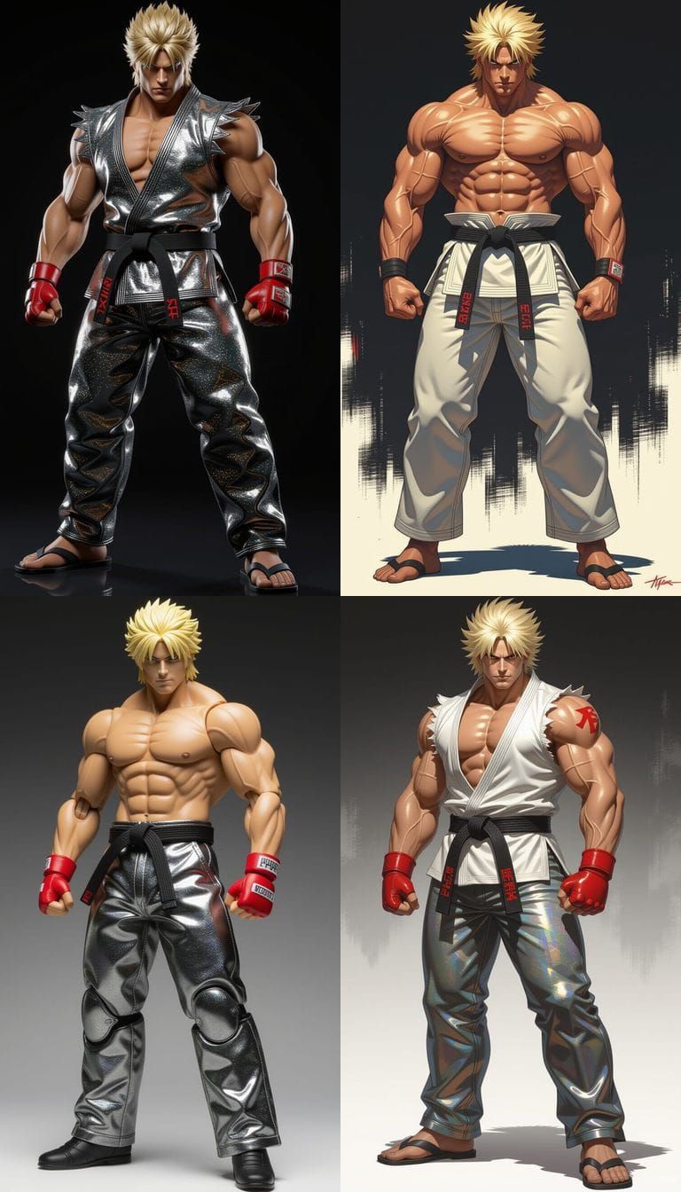 This image shows Ken Masters reimagined as Kazuya Mishima in a hyper-realistic portrait. The artwork features cinematic lighting, deep colors, and shimmering mithril pants, emphasizing intense focus and a muscular physique.