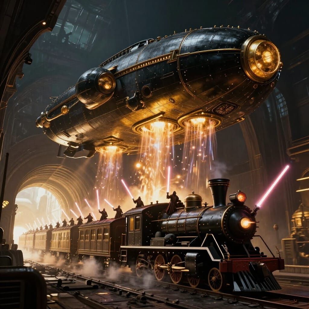 Generate your own epic steampunk airship and train scenes with our free and easy AI image creator. Unleash your creativity!