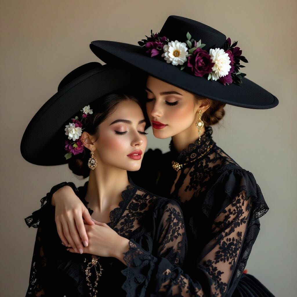This image shows two Spanish women in traditional Cordobés clothing. They wear elegant black outfits with lace details and wide-brimmed hats, set against a muted background in soft, warm lighting.