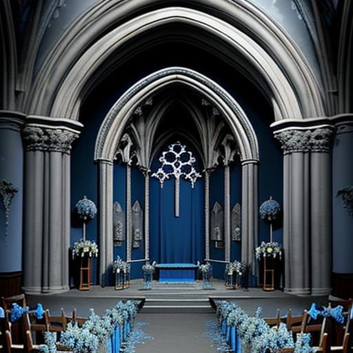 A striking picture of a decaying gothic cathedral altar decorated with faded blue flora and shimmering grey pearls. The image evokes a scrapbook aesthetic with its layered textures.