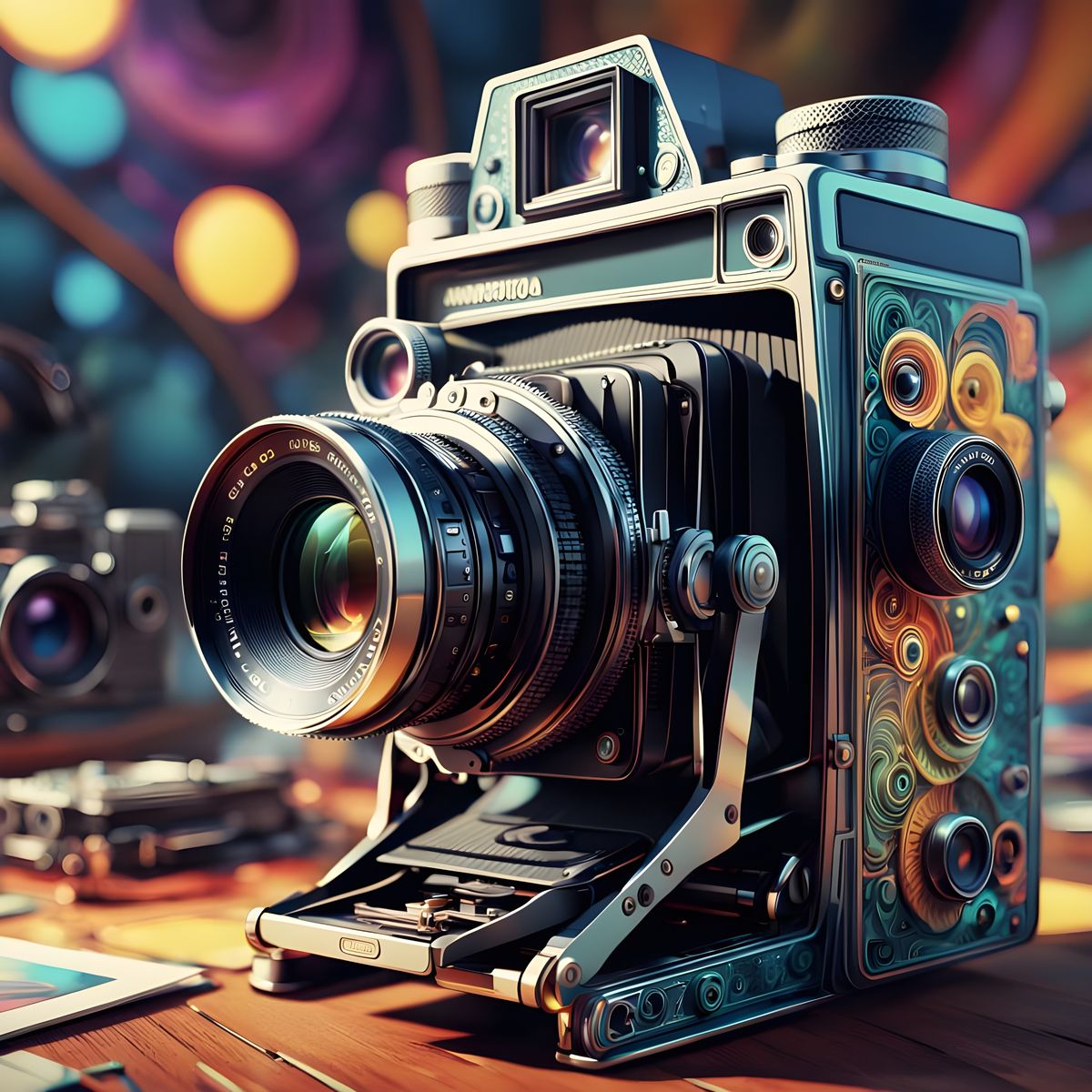A close-up of a vintage camera rendered as manga-style anime art. The image features cinematic lighting, deep colors, and intricate details against a colorful, abstract background.