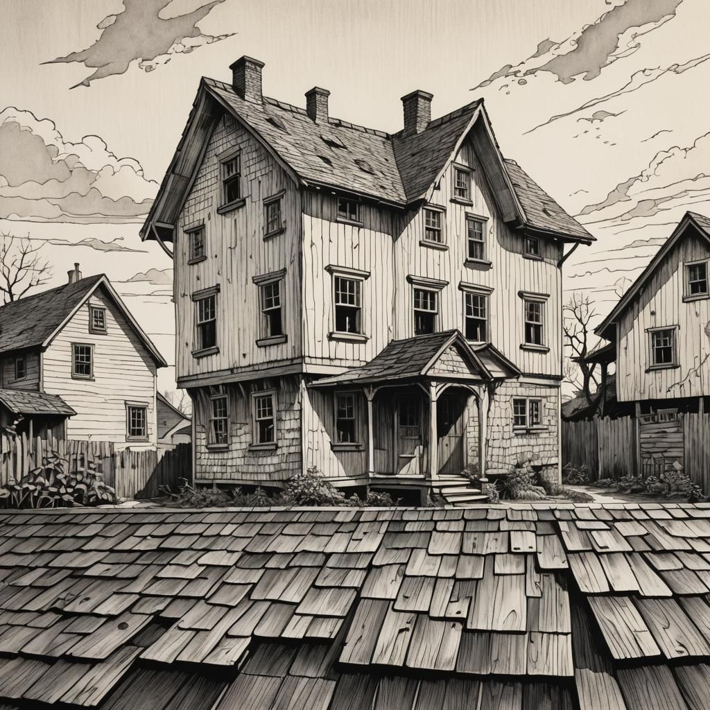 A striking picture of a weathered two-story house with a shingle roof, rendered in fine black ink on white. The illustration captures a whimsical and peaceful atmosphere with simple, expressive lines.