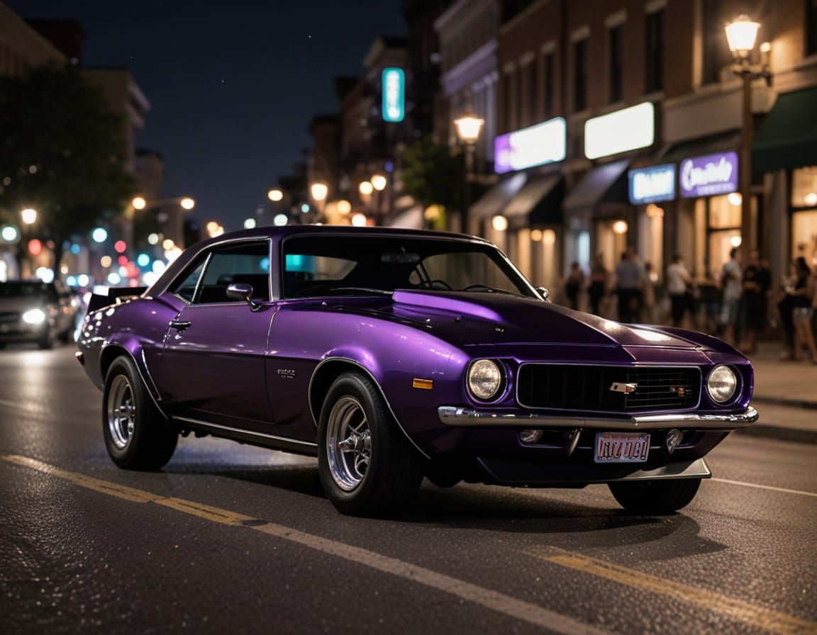 This image captures a classic American muscle car in a dramatic night-time scene, illuminated by moonlight and city streetlights, showcasing a vintage purple Chevy Camaro in a fiery burnout, shot with professional photography techniques and sharp focus.