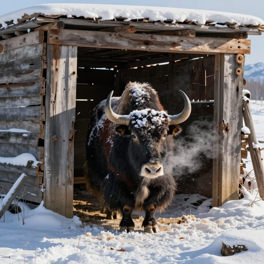 This image depicts a beautiful, shaggy yak exiting a weathered, snow-covered shed as sunlight streams through cracks. Rendered in a painterly style with rich textures and dramatic lighting.