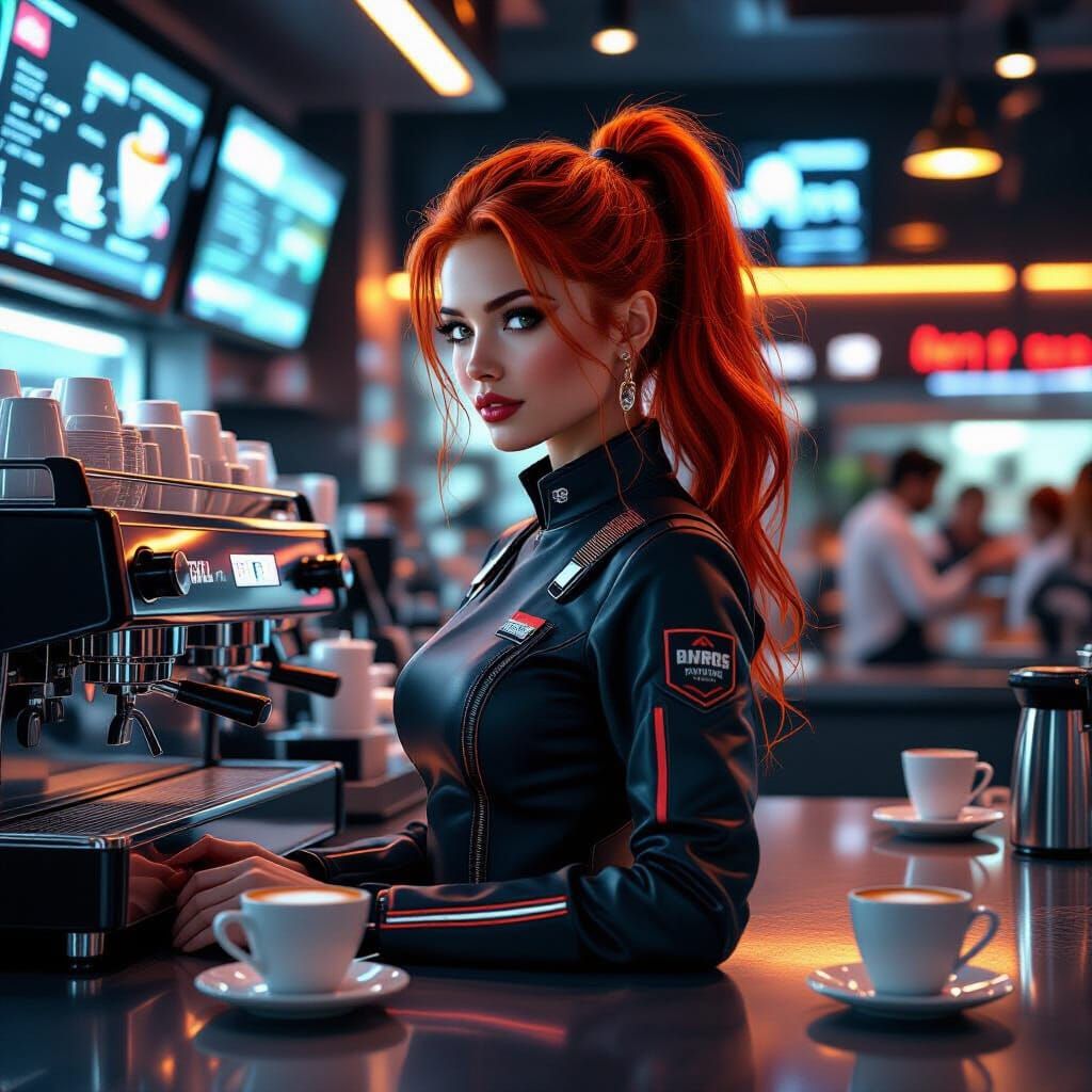 This image shows a barista with vibrant red hair working in a futuristic cafe. Holographic displays and levitating cups enhance the high-tech atmosphere, rendered with cinematic lighting and ultra-fine textures in a concept art style.