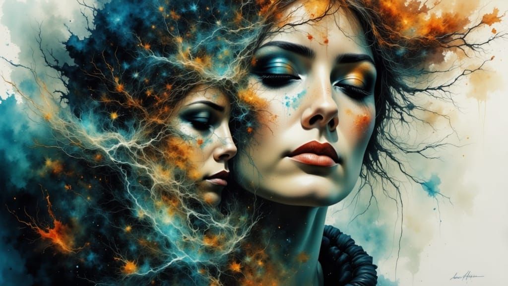 A surreal image showcasing a dreamlike ethereal beauty. This artwork features unexpected juxtapositions and visual paradoxes, with a watercolor and ink aesthetic creating a photographic illusion.