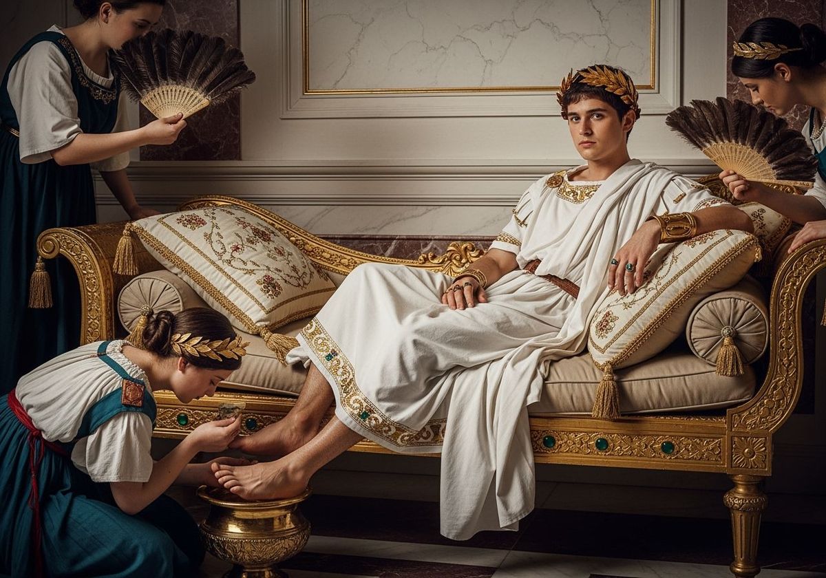 This image shows a young Roman emperor relaxing in his palace. Servants attend to him in the luxurious, intricately detailed scene, reminiscent of classical paintings with dramatic lighting.
