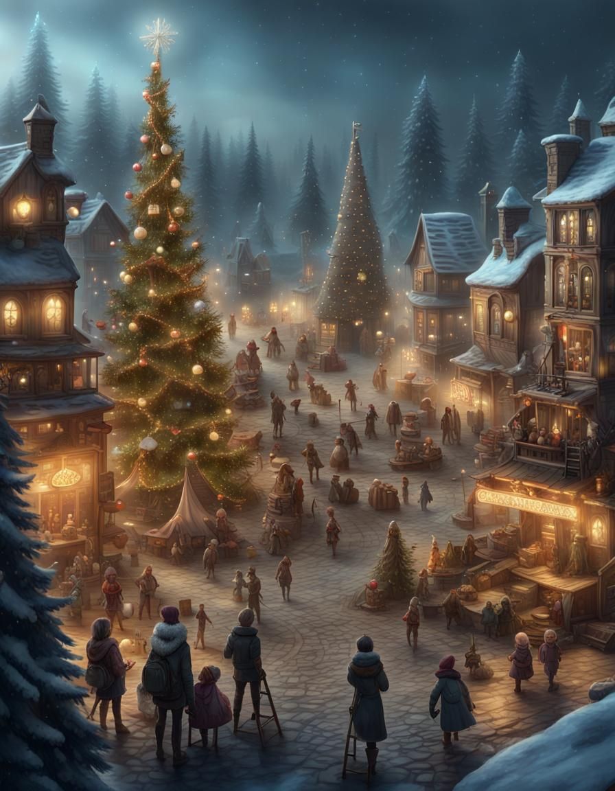 A vibrant image of a pixie village nestled in a dimly lit forest. Pixies are preparing for Christmas, decorating a tall tree and buildings with lights and ornaments in a steampunk aesthetic.