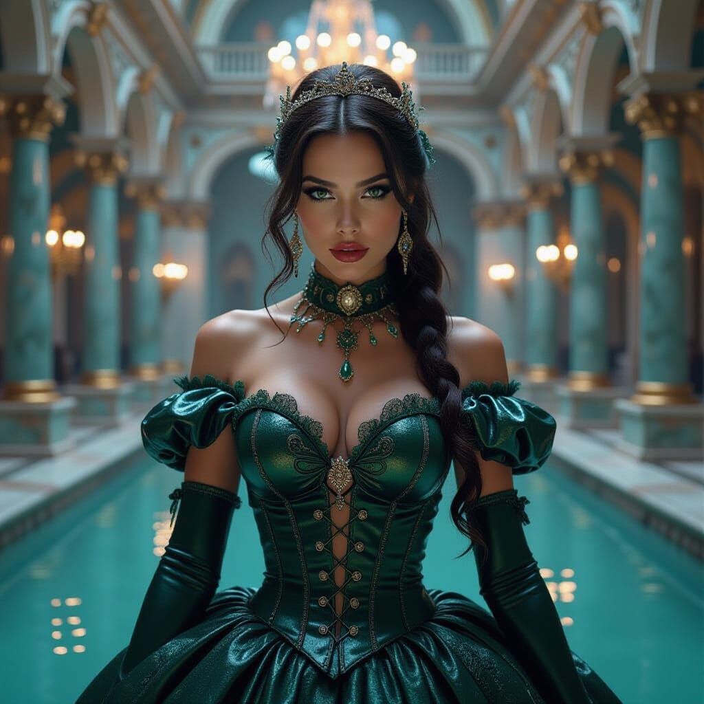 This image depicts Harley Quinn as an urban model in a grand, slimy baroque sculpture. She wears a lavish, iridescent gown and jewelry against a majestic palace backdrop.