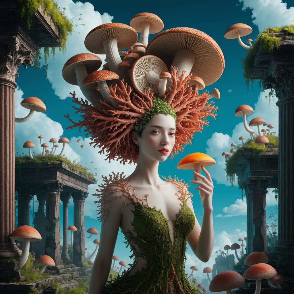 This image shows a woman with a fungal headpiece, surrounded by a surreal fungal ecosystem. Dreamlike ruins and floating mushrooms complete the vibrant, ethereal atmosphere in this digital artwork.