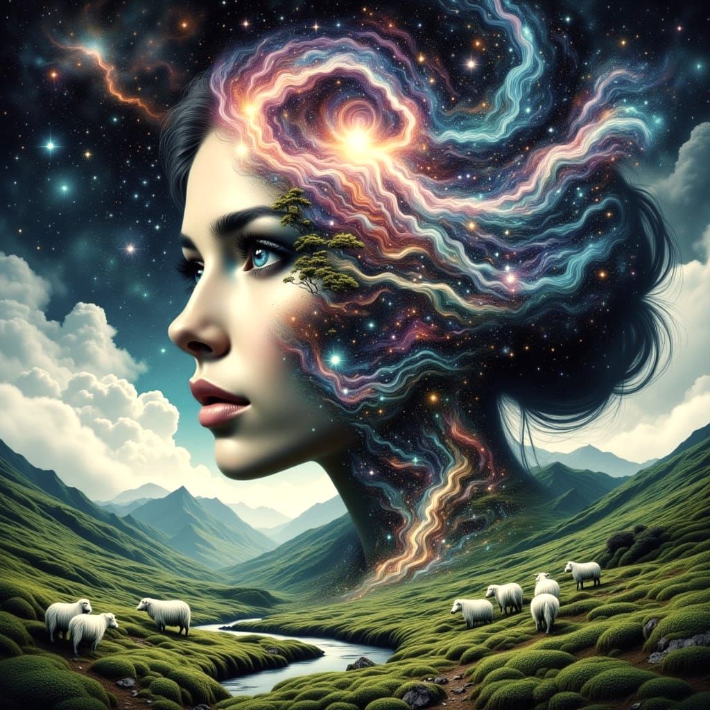 This surreal image depicts a cosmic galaxy blending into a detailed natural landscape with trees, hills, swamps, and sheep, rendered in a psychedelic, hyper-detailed style.