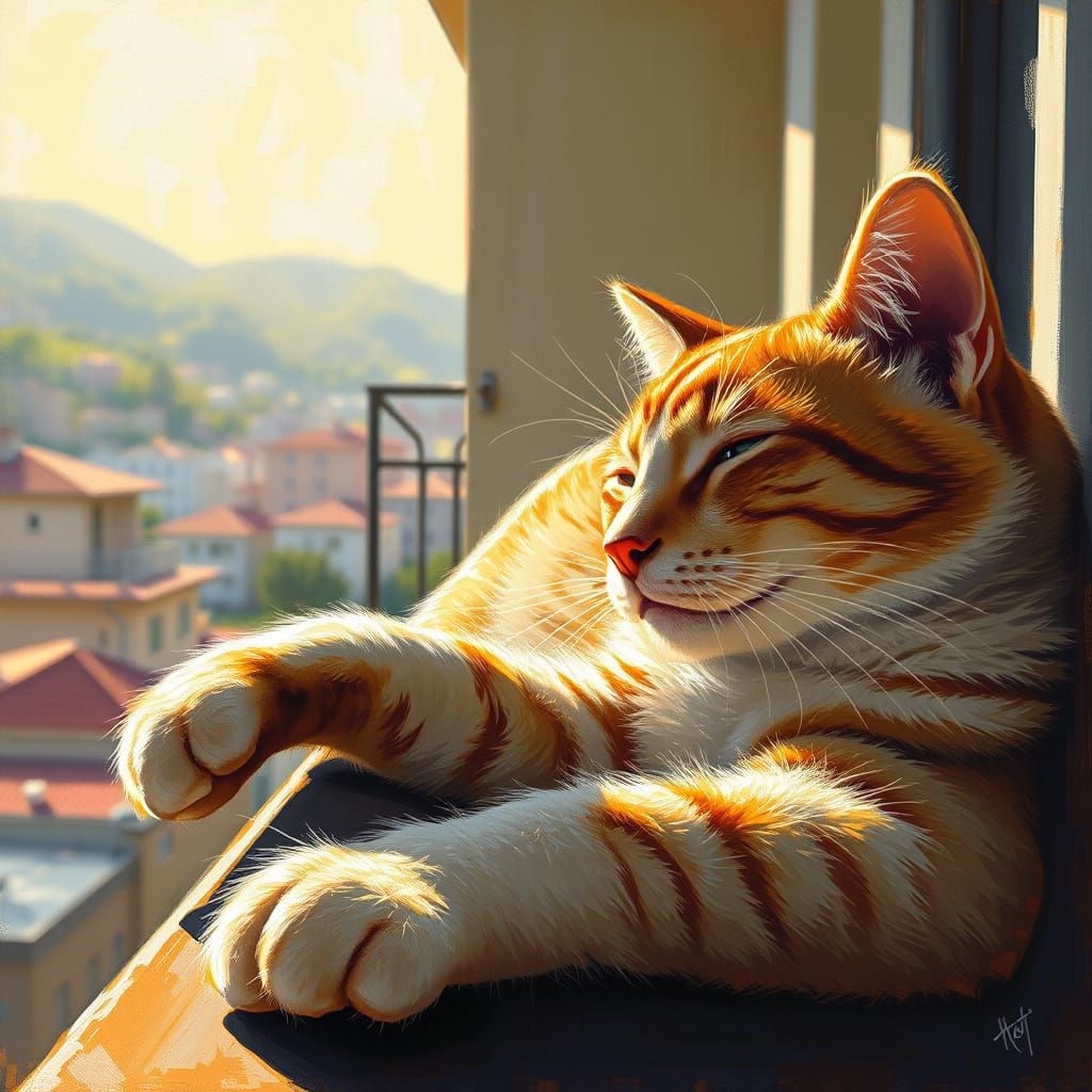 This image shows a domestic cat stretching on a sunlit balcony, rendered in an expressive oil painting style with warm colors. The artwork captures a tranquil moment of relaxation.
