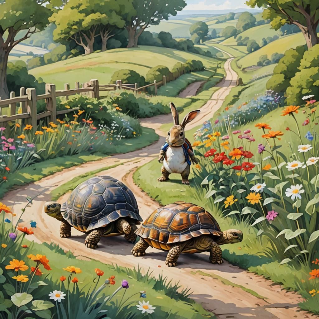 This image shows a rabbit and tortoise walking hand in hand down a country path. The scene is vibrant and colorful, depicting a bright, cheerful day.