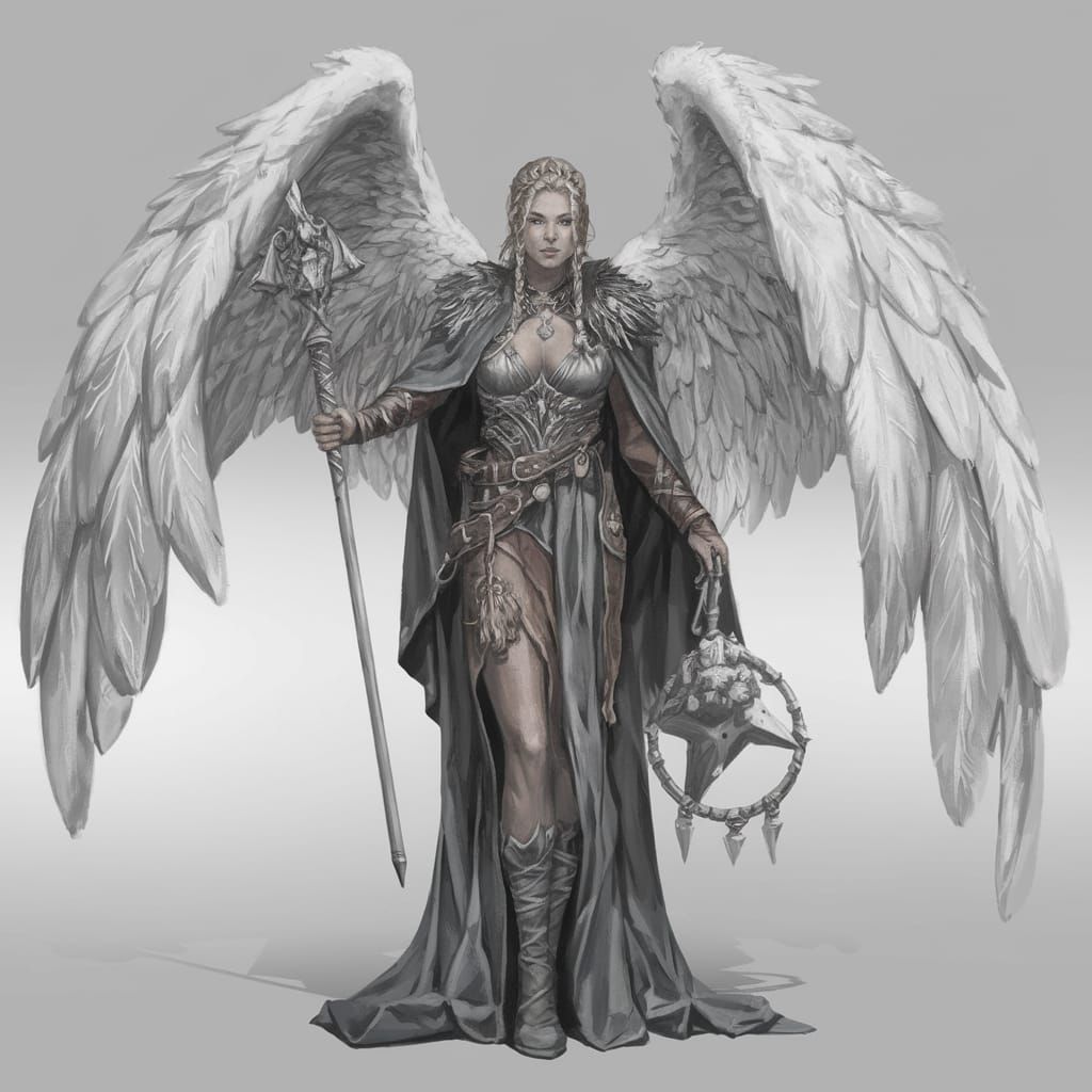 This image shows a Viking warrior angel depicted in stunning pencil art, with a serene and ethereal quality to her features and a masterful blend of natural skin tones and textures.