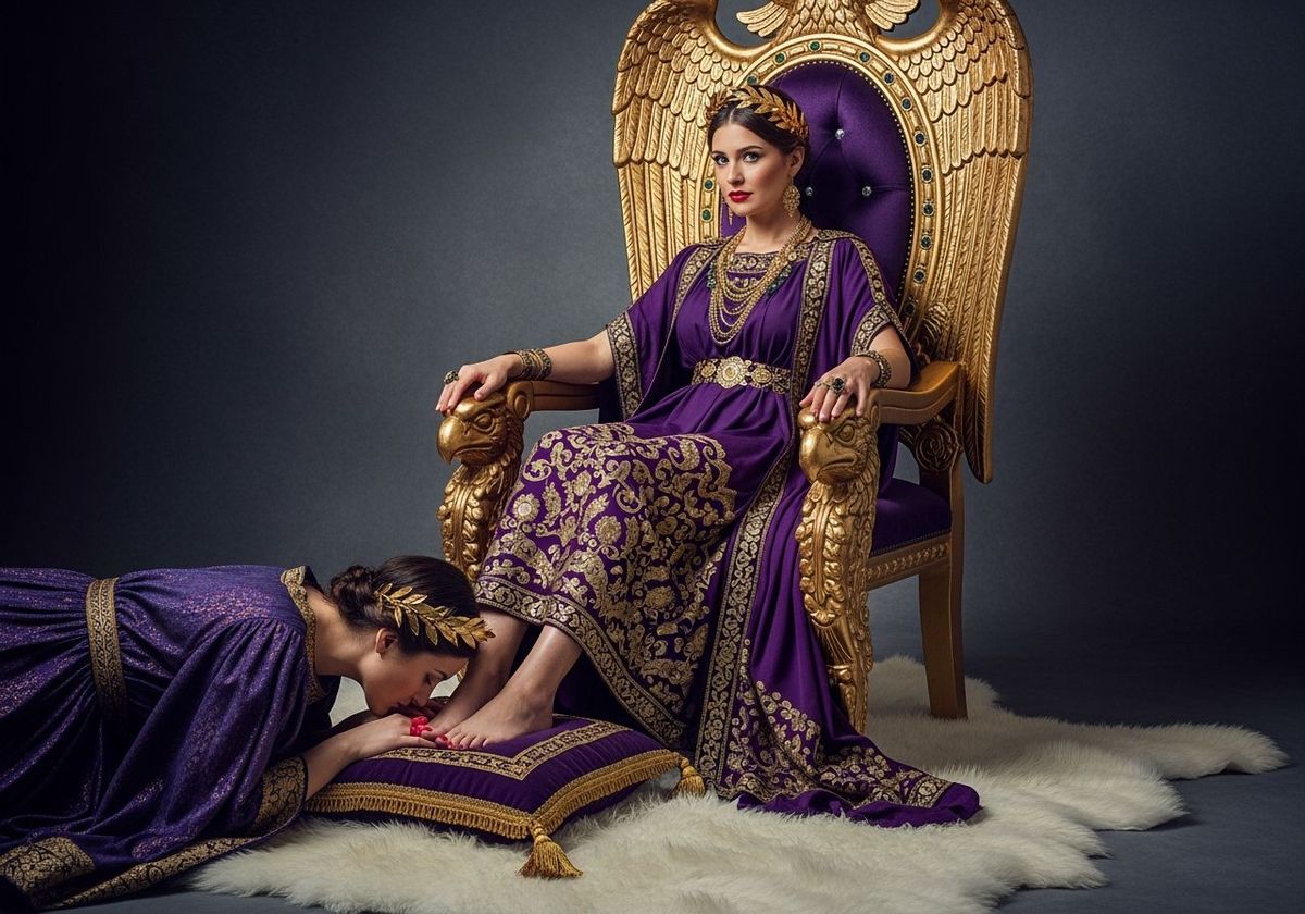 This image shows a Roman Empress on an opulent throne. Photorealistic rendering captures her regal pose as a priestess pays homage in a scene reminiscent of high-fashion photography.