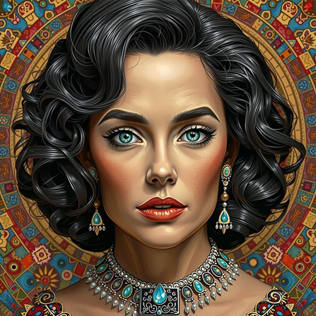 A photorealistic 3D render of Elizabeth Taylor with fine details. This cinematic masterpiece captures a highly detailed, pretty face in a maximalist style reminiscent of abstract expressionism.